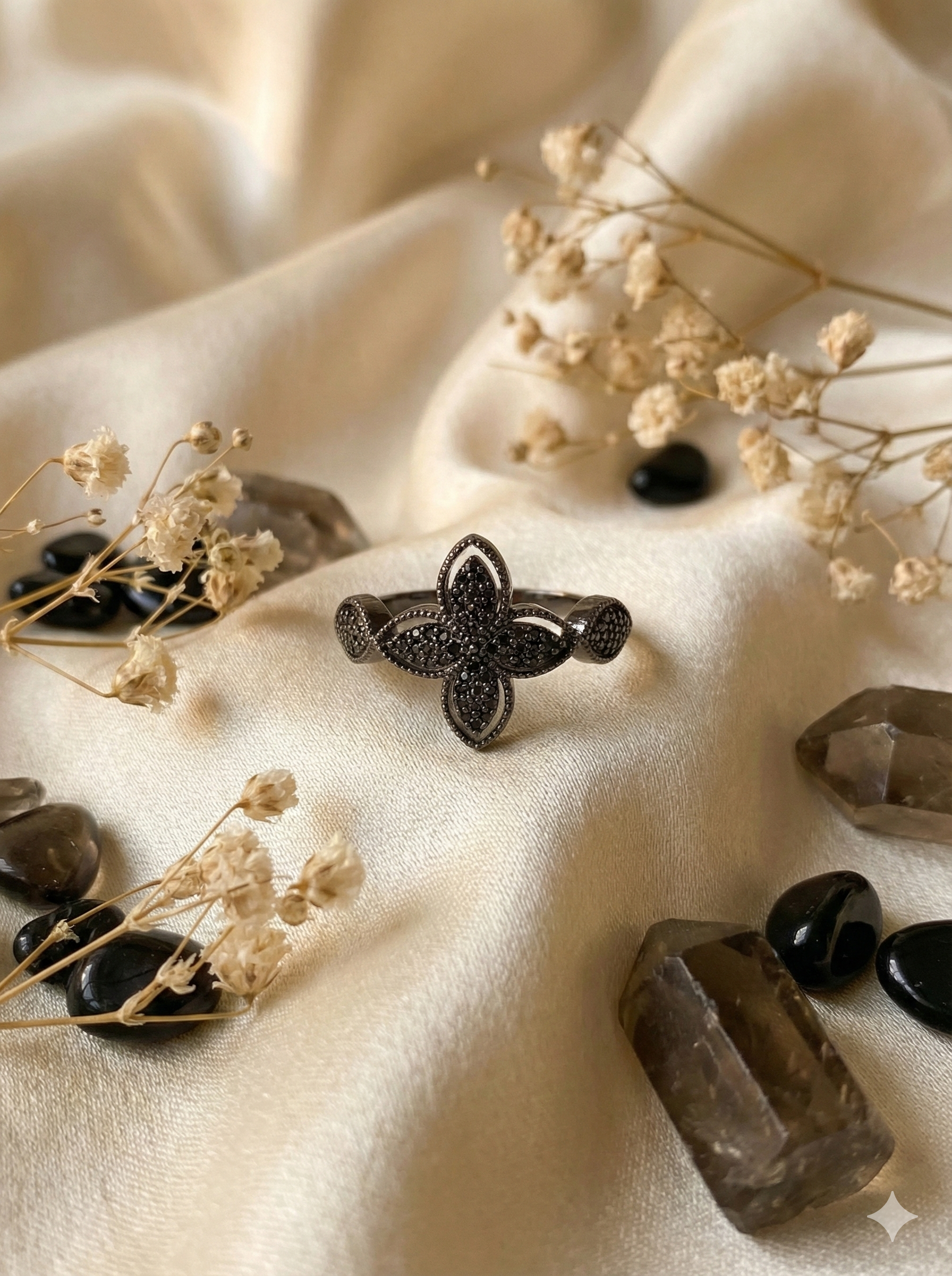 The Black Royale Flower Ring is crafted with a striking four-petal floral motif, delicately set with shimmering black stones and finished in a deep black tone. Bold yet graceful, this ring captures timeless floral elegance with a modern dark-luxe touch—perfect for refined statement wear.
