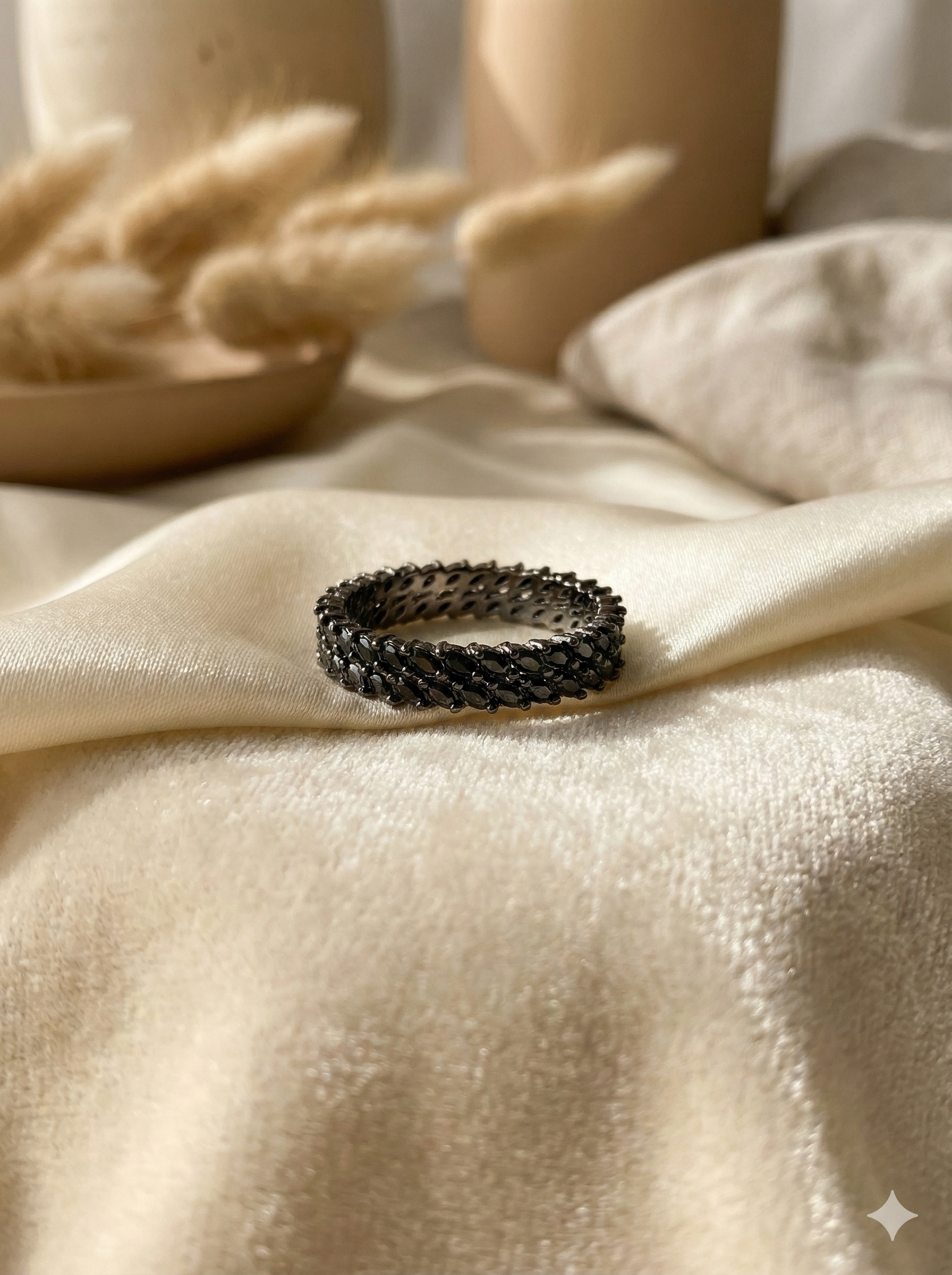 A striking eternity-style ring crafted with interwoven leaf-inspired motifs, each set with dark marquise stones that create a rich, textured shimmer. Finished in a deep black tone, this design wraps the finger in elegant detail—perfect for those who love nature-inspired luxury with a bold, modern edge.