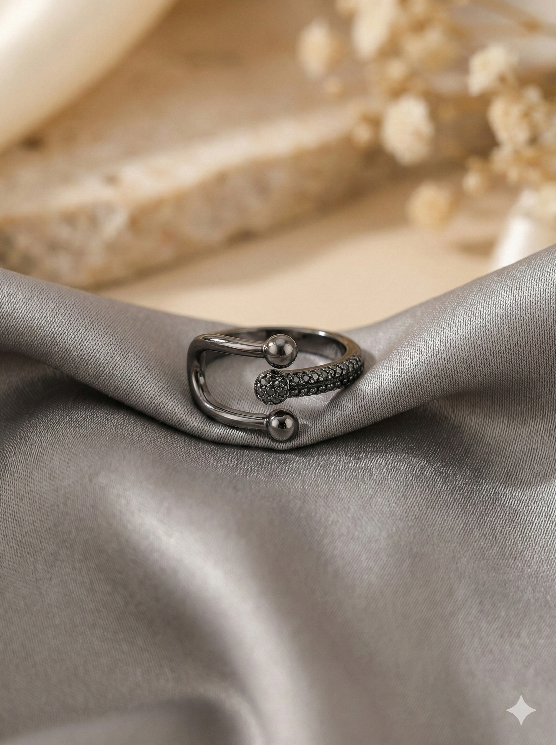 A sculptural open-band ring finished in sleek black polish, highlighted by pavé-set dark stones that catch light with quiet intensity. The fluid, adjustable design wraps effortlessly around the finger, balancing modern edge with refined elegance—made for confident, everyday luxury.