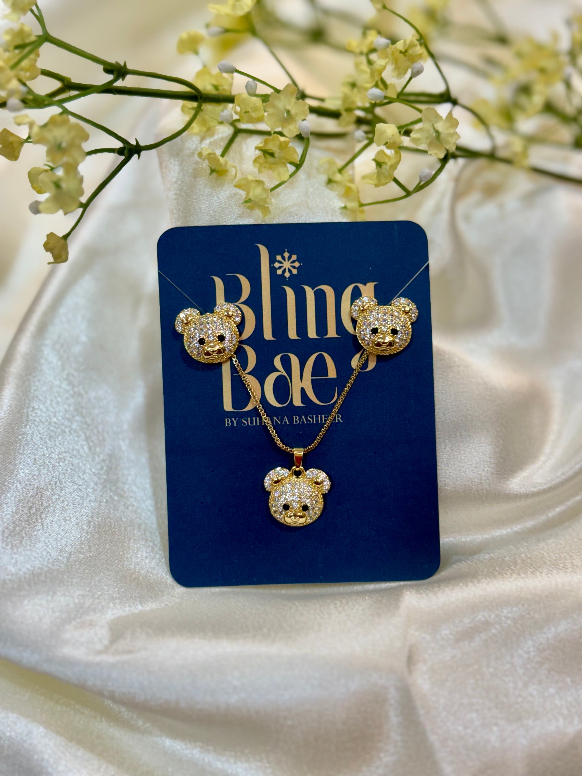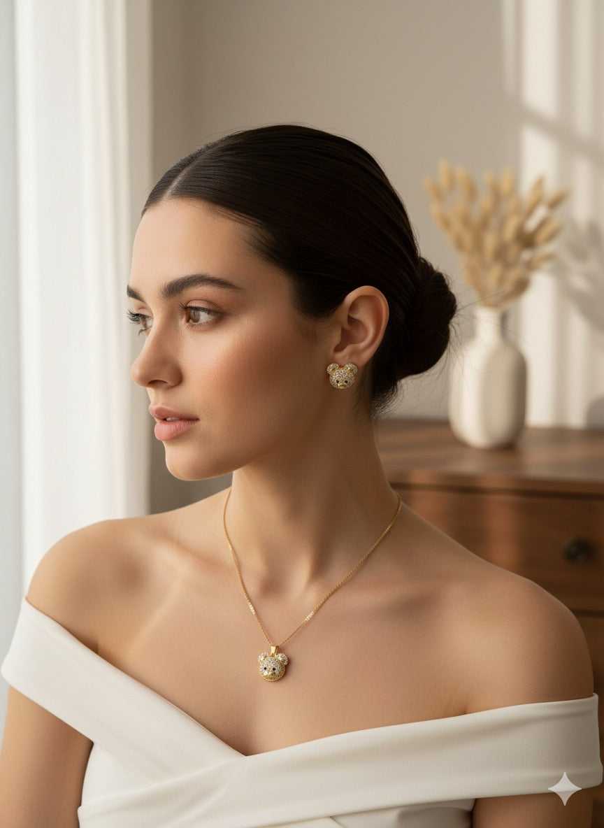 Pave Teddy Bear Pendant and Studs
